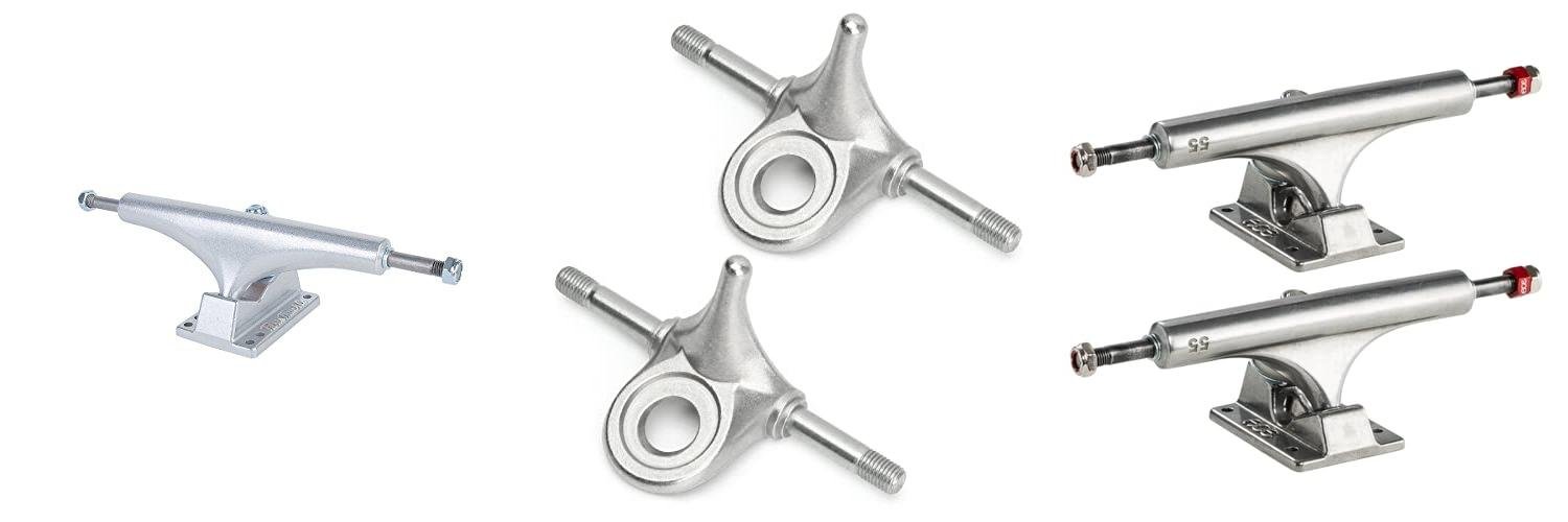 The part of the truck where the wheels actually go on is called the axle. These are almost always made of steel. Steel is very strong and can handle the force of your wheels spinning and the impacts from tricks.